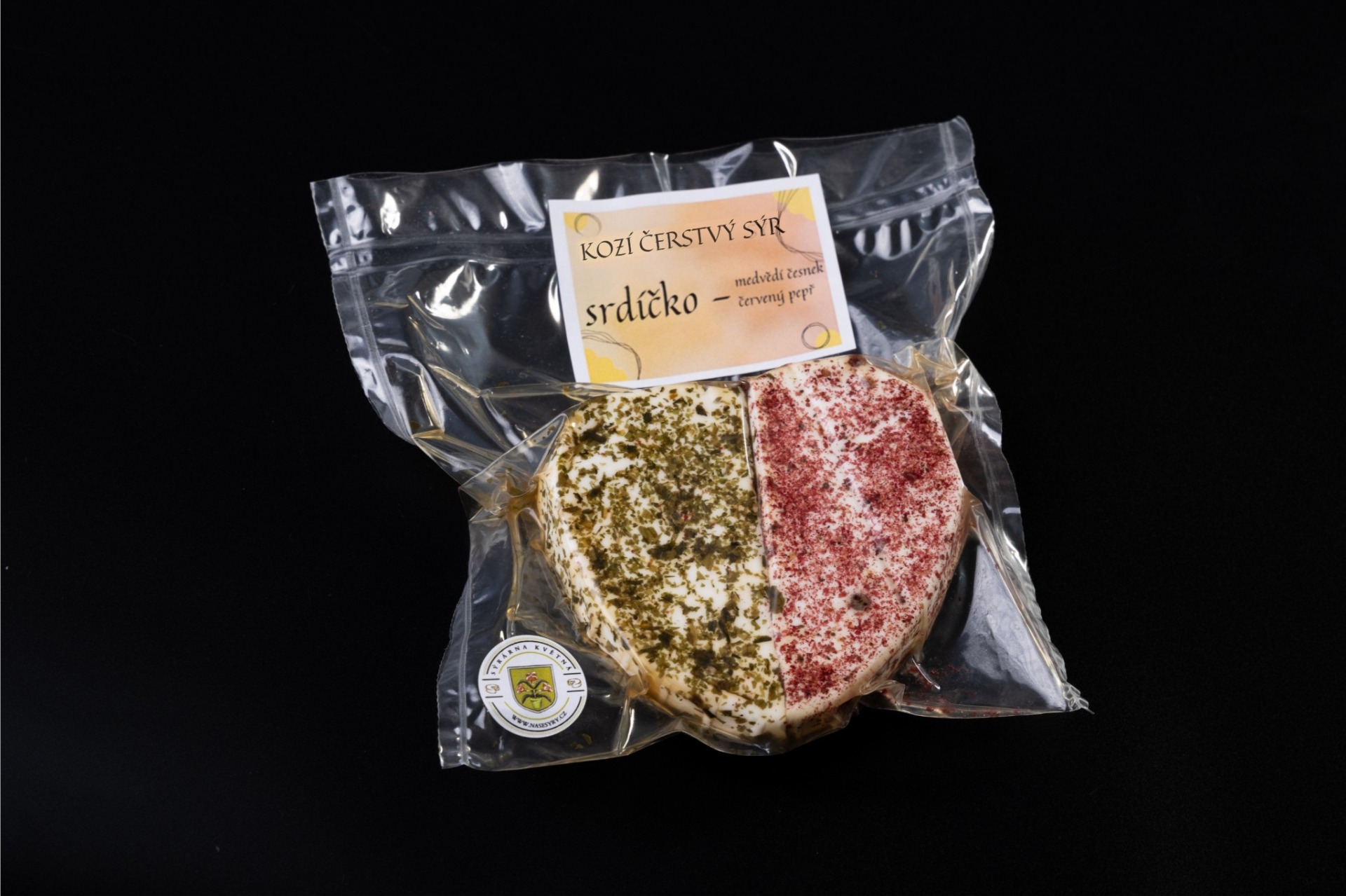 "Srdce mix 2" nabízí kombinaci našich ochucených čerstvých kravských sýrů (červený pepř, medvědí česnek). Vhodné i jako součást dárkových balení.