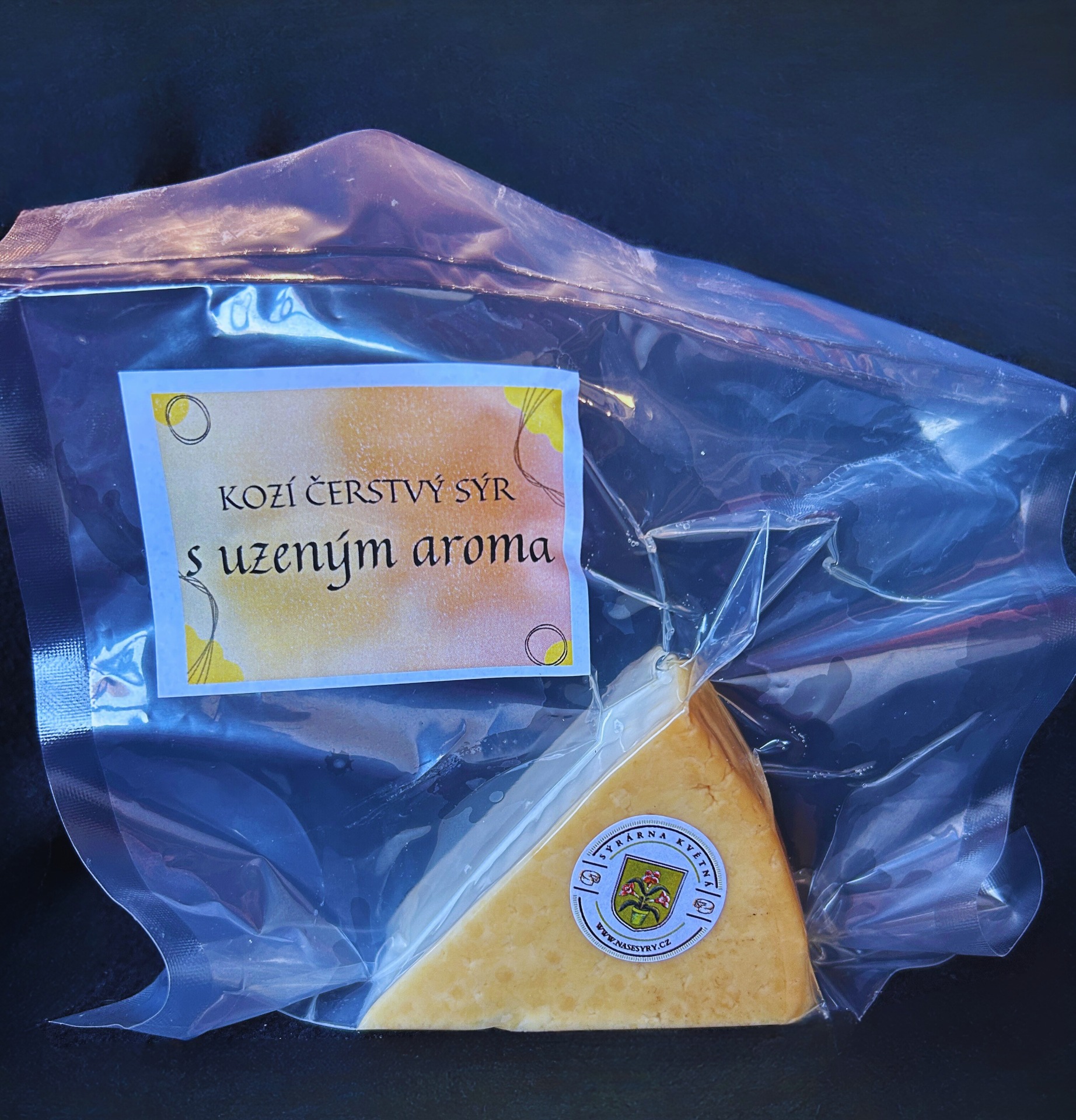 Uzený kozí sýr, jehož uzení probíhá v dřevěné udírně studeným kouřem z bukových pilin.